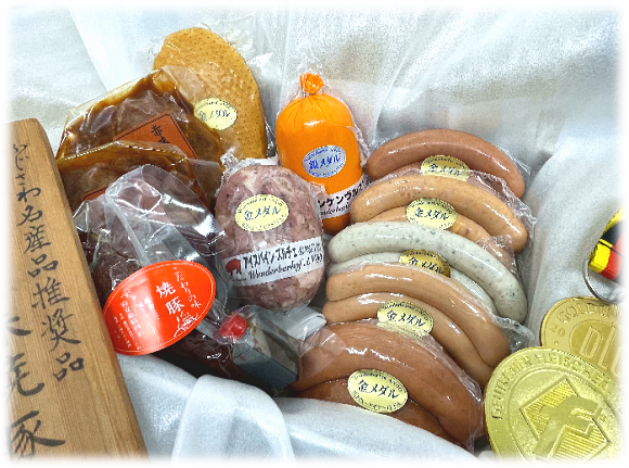 ■ 焼豚1本(275g以上)、豚赤味噌漬は1パック(2枚入り)×2袋 、シンケンヴルスト1本(200g以上)、合鴨スモーク1枚(170g)、アイスバインズルチェ1本(200g以上)、腸詰5種類(14本入り)